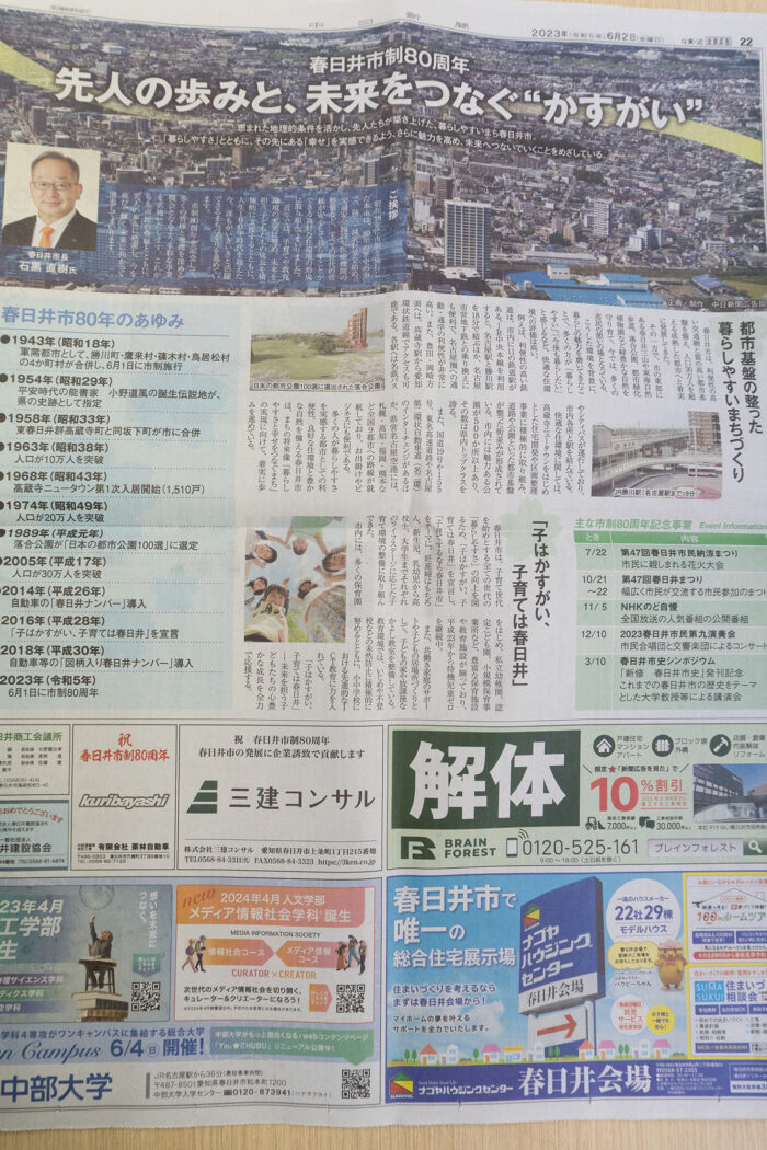 BrainForestはこれを記念した中日新聞春日井市制80周年特集に協賛しました。
