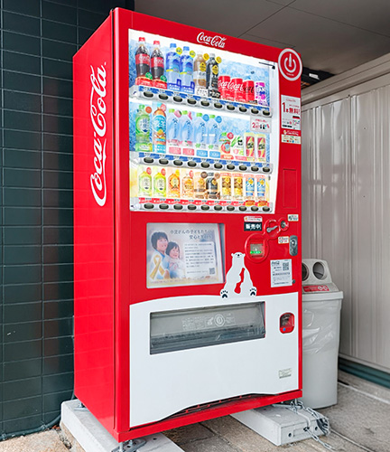 本社前にSDGs自販機を設置。売上の一部を認定公益財団法人ゴールドリボン・ネットワーク様に寄付し、小児がんの子どもたちを支援する活動に役立てています。